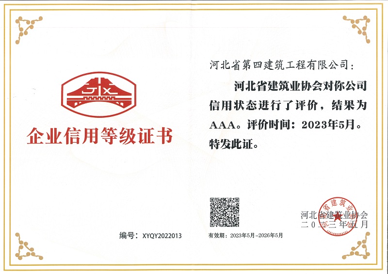 河北四建:中装协“AAA级企业信用等级证书”